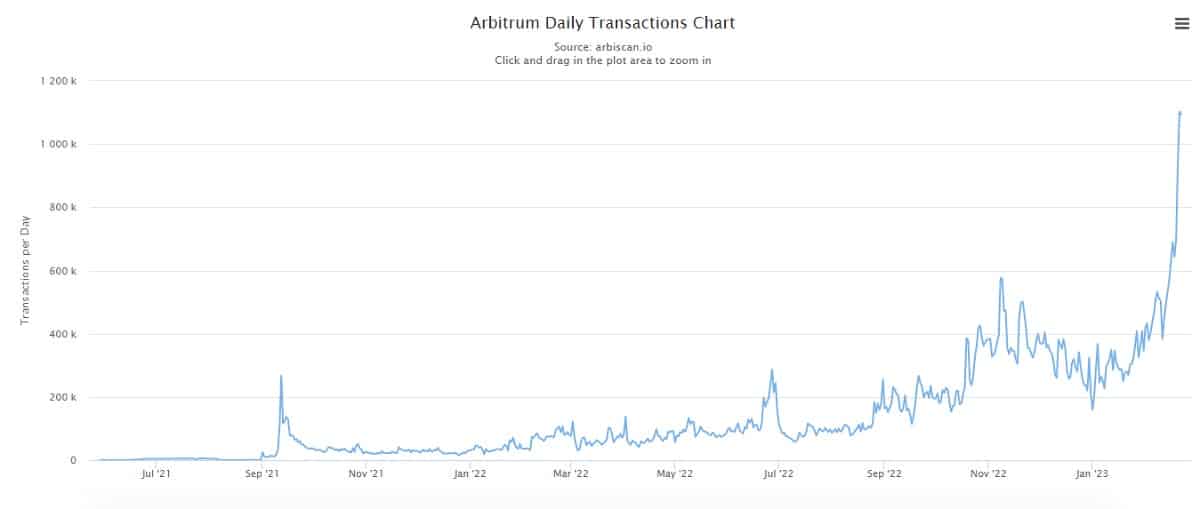 La red de Arbitrum, la cual funciona como un rollup similar a una cadena lateral en Ethereum, procesó 1,1 millones de transacciones el miércoles 22 de febrero, mientras que en la red principal hubo una media de 1,08 millones.