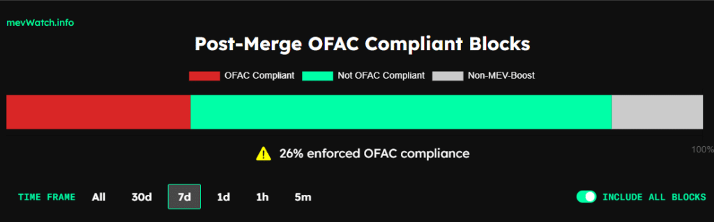 Para fundamentar esta postura, Eric Wall detalló lo que ocurrió hace poco en Ethereum en relación con el MEV. En un momento, el 80% de los bots de MEV que usaban los validadores de Ethereum estaban obligados a cumplir con normas de la Oficina de Control de Bienes Extranjeros (OFAC) de Estados Unidos.