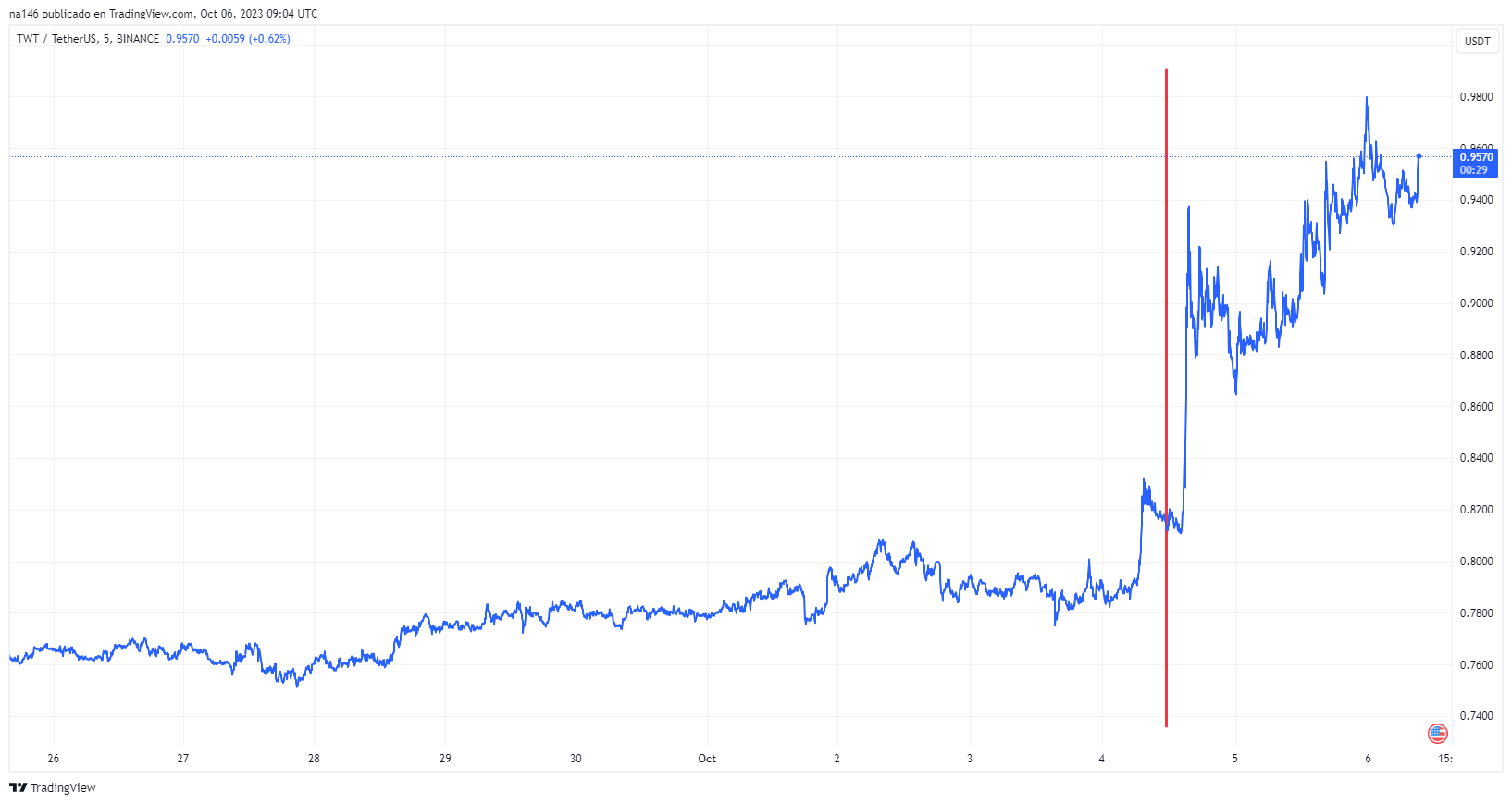 En el siguiente gráfico, elaborado con las herramientas de la plataforma de análisis, TradingView, se observa cómo el precio de TWT se dispara justo en el momento en el que se realiza la mencionada publicación en la red social X: